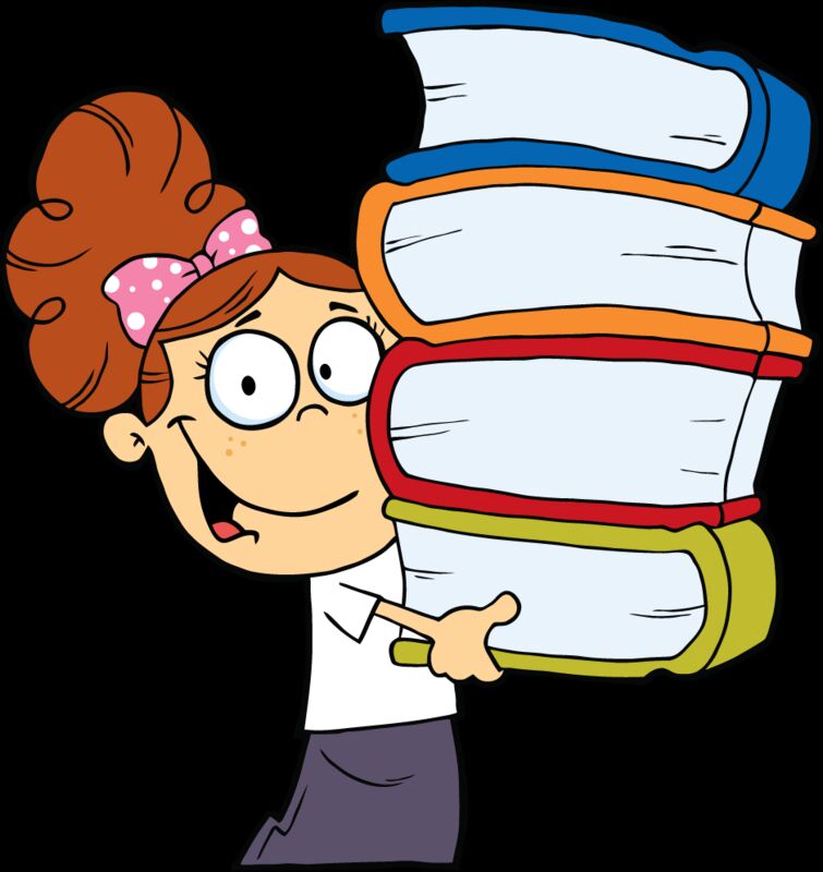 girl with bun holding 4 big books